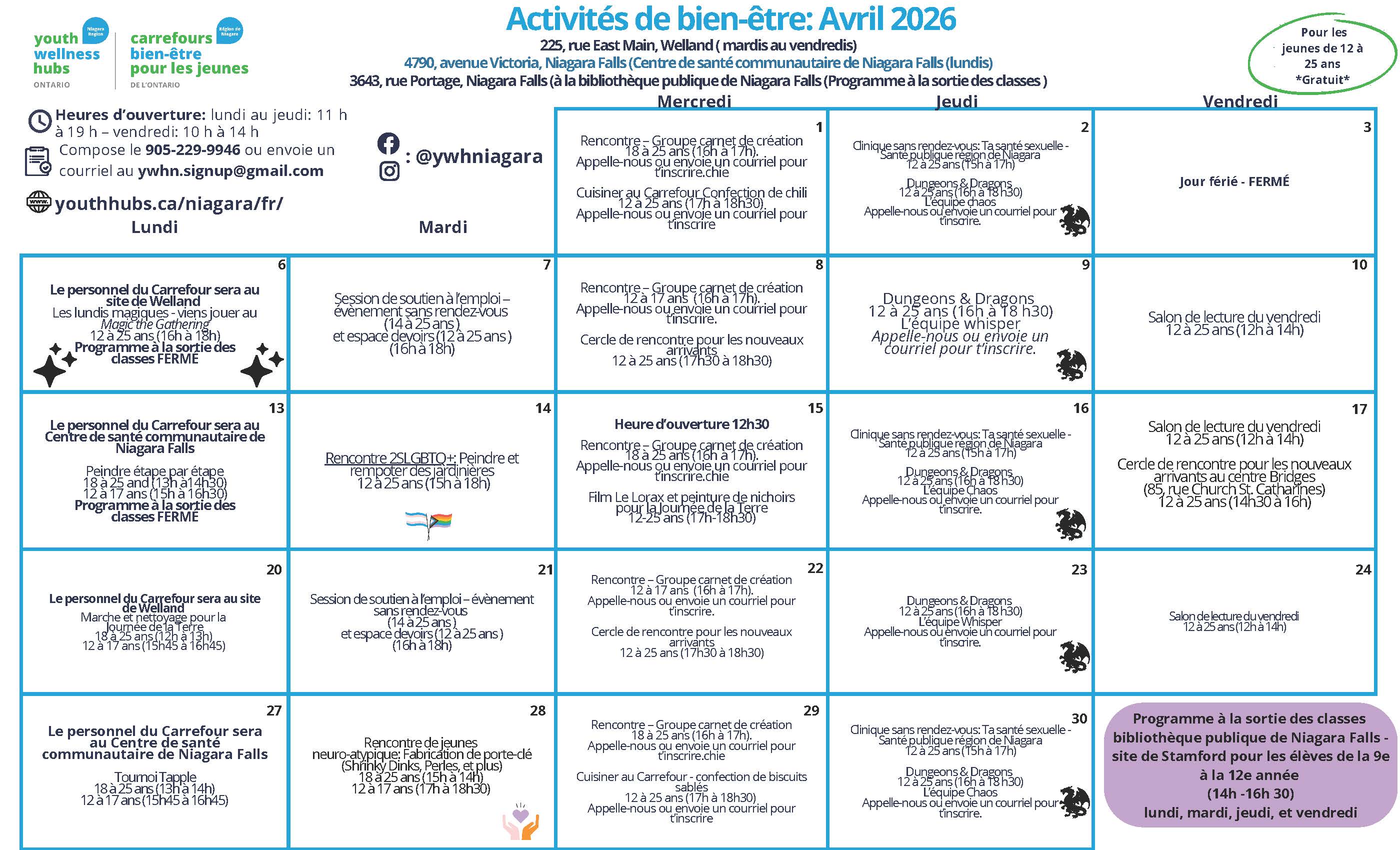 Découvre les centres de services du Carrefour bien-être pour les jeunes de la Région du Niagara en te rendant sur nos médias sociaux :