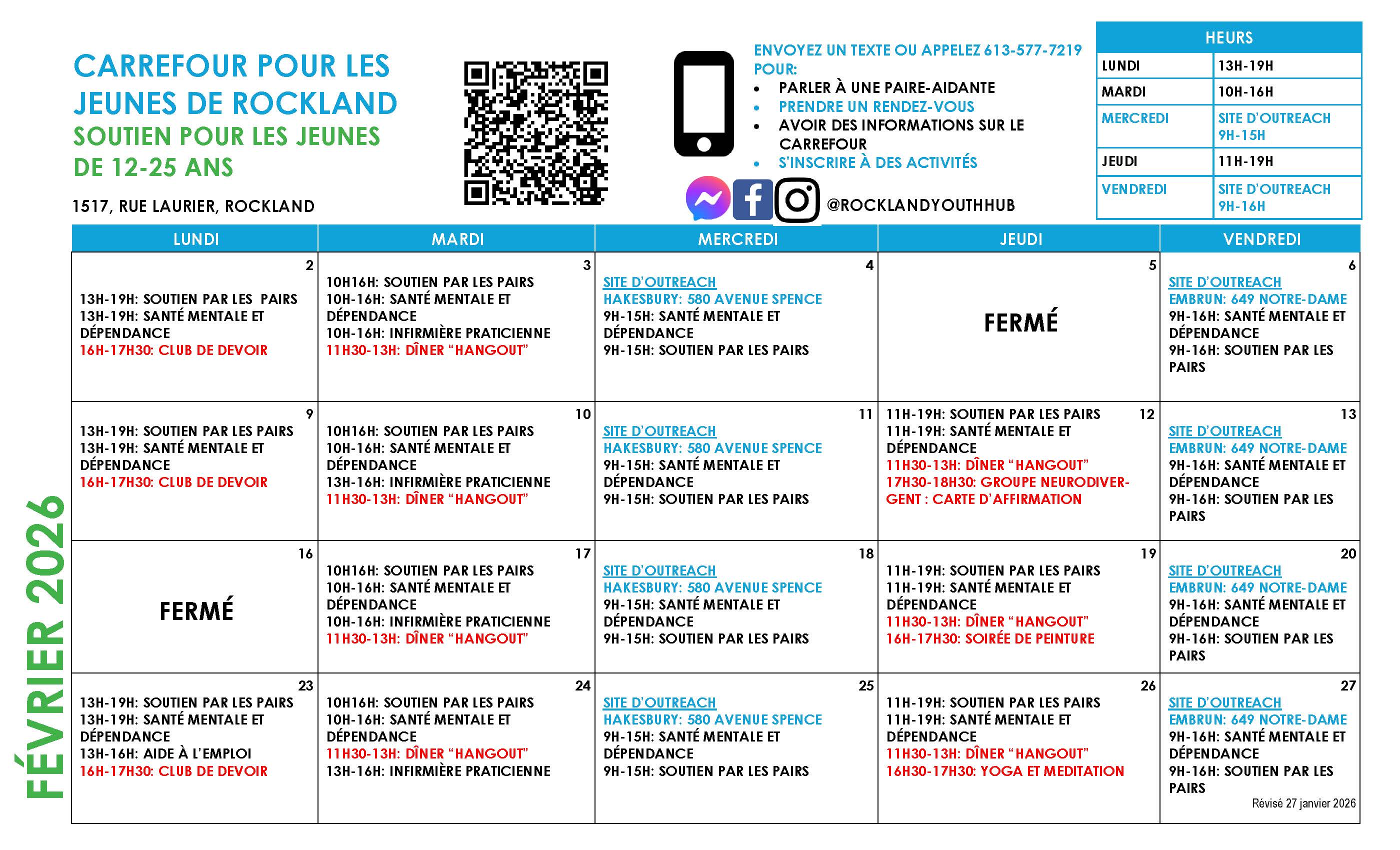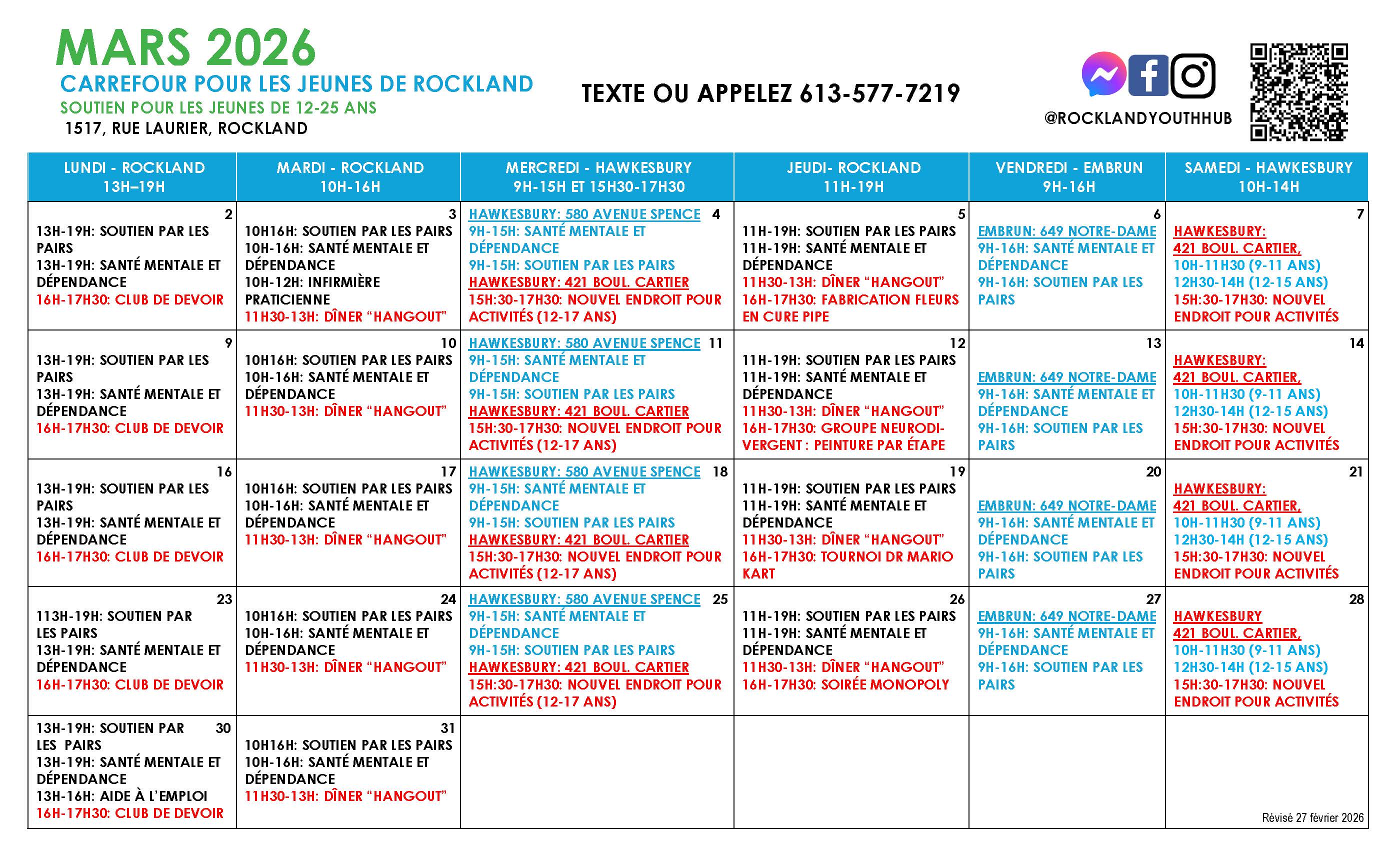 Le Carrefour bien-être pour les jeunes de Rockland et Prescott-Russell offre des services à partir de son centre de services principal à Rockland et des deux centres de service à Hawkesbury et à Embrun.